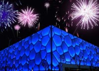 国家游泳中心又被称为水立方Water Cube),位于北京奥林匹克公园内,是北京2008夏季奥运会修建的主游泳馆,也是2008年北京奥运会标志性建筑物之一。它的设计方案,是经全球设计竞赛产生的水的立方[H2O]3)方案。20031224开工,在2008128竣工。其与国家体育场(俗称鸟巢)分列于北京城市中轴线北端的两侧,共同形成相对完整的北京历史文化名城形象。国家游泳中心规划建设用地62950平方米,总建筑面积65000-80000平方米,其中地下部分的建筑面积不少于15000平方米,长宽高分别为 177m × 177m × 30m。到目前,来自101个国家和地区的35万多港澳台同胞及海外侨胞共捐献了9.4亿人民币。