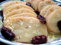 北京早年城内三海(什刹海、后海、积水潭)多种莲藕,其中以白花藕(有吃红花莲蓬白花藕的说法)为上品。老北京以什刹海北的会贤堂制作的最为有名当时还有不少沿街叫卖者,多为清真小贩。小贩在街上吆喝“江米哎----藕!”江米藕色泽淡红,质地软糯嫩爽,味道甜面嫩香,老人食用可补气润肠。