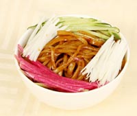 炸酱面是北京有特色的食物,也称为杂酱面,由菜码、炸酱拌面条而成。