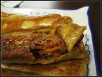 店里从早到晚一直营业,可供选择的小吃种类也会随着时间而有所不同,早餐一般会另做一些油饼、糖饼,其他的像糊塌子、咸油酥、烧饼、包子、螺丝转儿等主食从早到晚既可做早餐也可做正餐来享用。糊塌子,原料用的是精面粉、西葫芦和鸡蛋,味道咸香,口感软嫩。